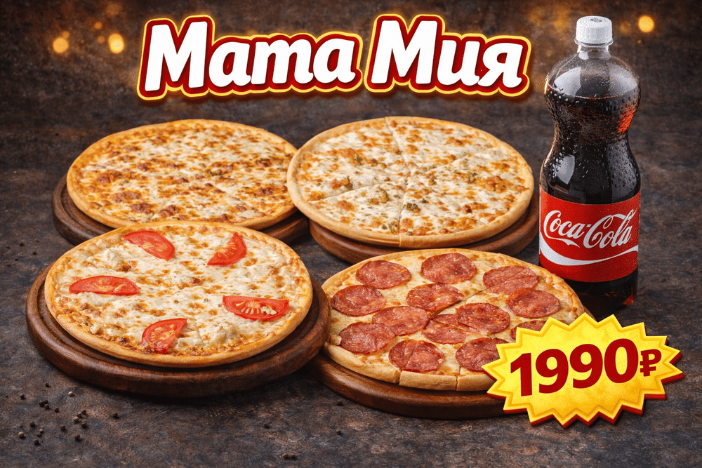 Пицца Куриная, пицца Пепперони, пицца Сицилия, Пицца четыре сыра, литр Coca-Cola