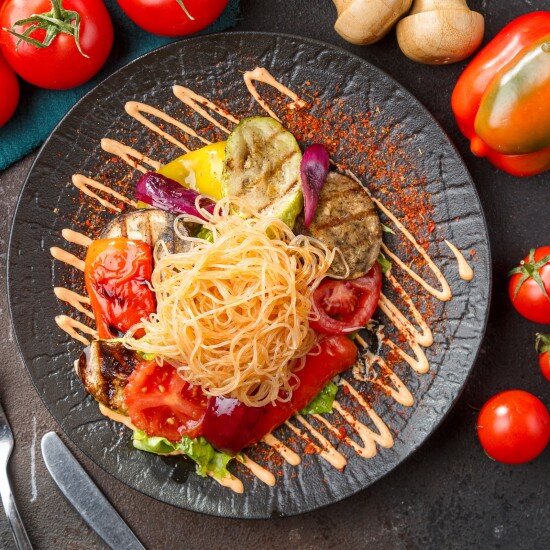 Салат с печеными овощами и фунчезой