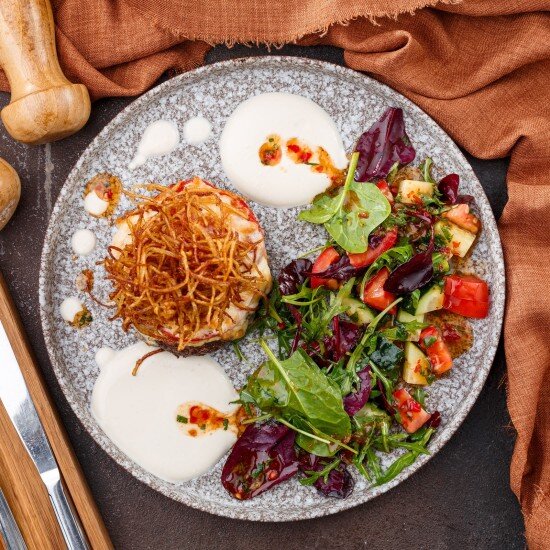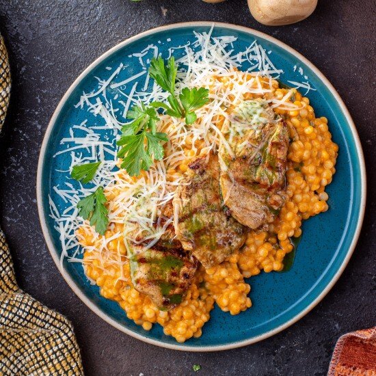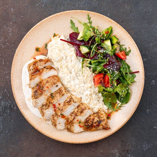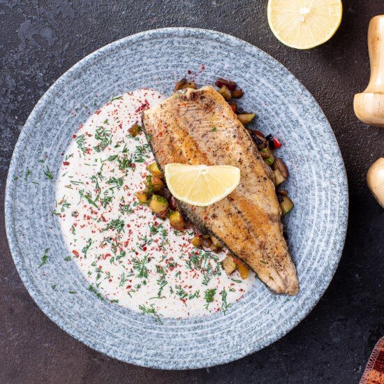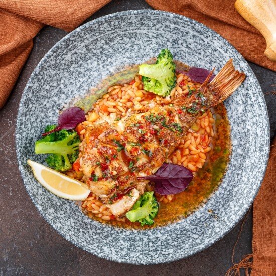 Окунь морской запеченный с пастой орзо и тайским сосом
