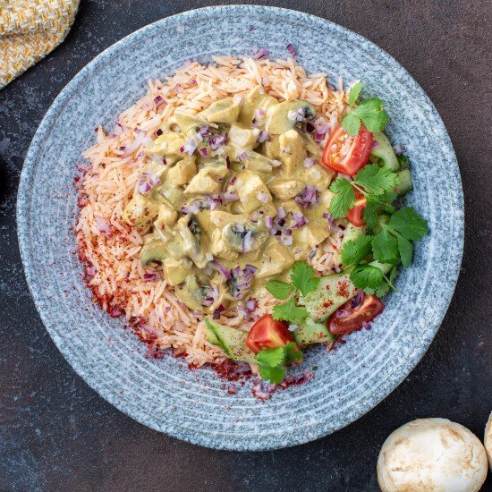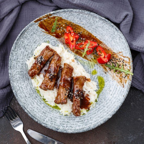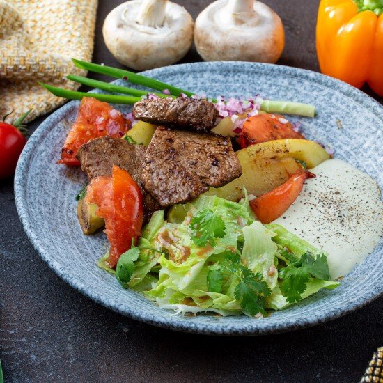 Нежная корейка говядины, шампиньоны, микс из овощей, помидор,