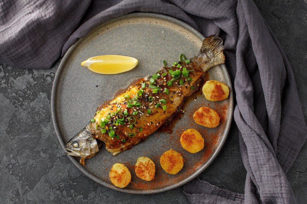 Форель на гриле с молодым картофелем.