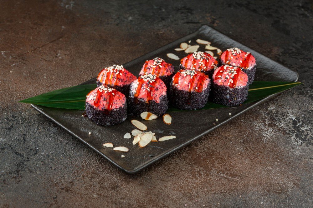 Сыр креметто, огурец, креветка, соус для запекания, соус унаги, кунжут, икра летучей рыбы