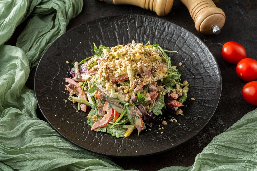 Красная фасоль, помидор , огурец ,говядина отварная, лук красный, микс салата, грецкий орех, фирменный соус.