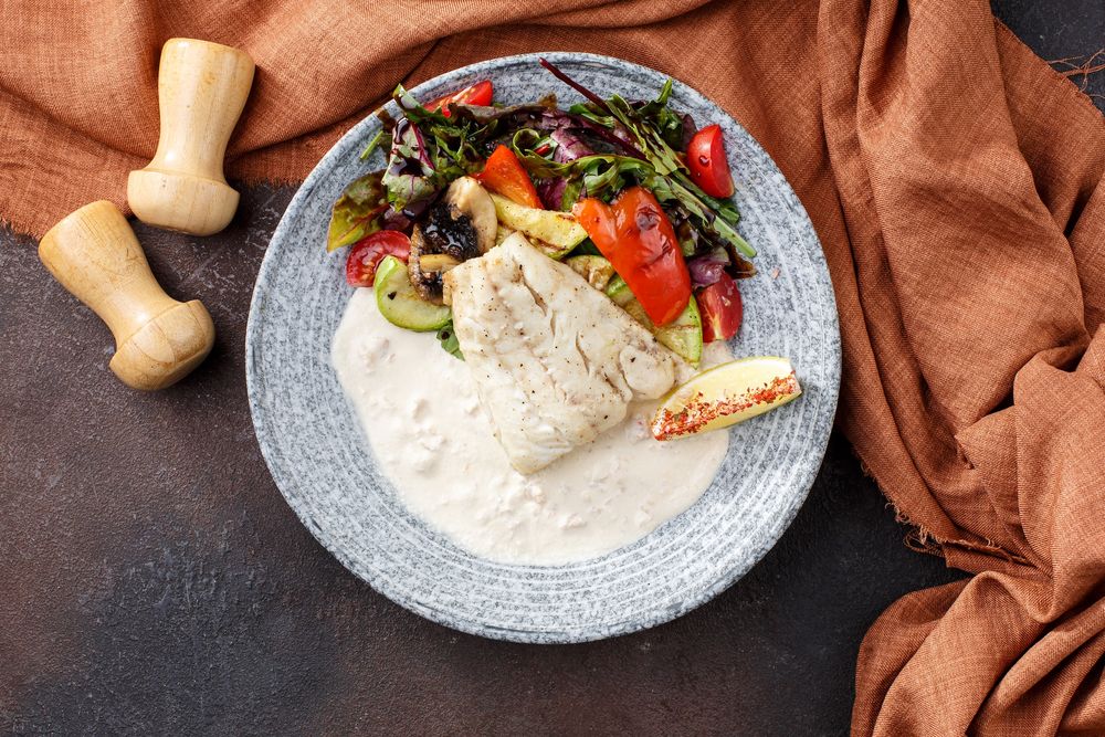 Каспийский судак, микс из овощей запеченных, микс салата, фирменный соус мореброд.