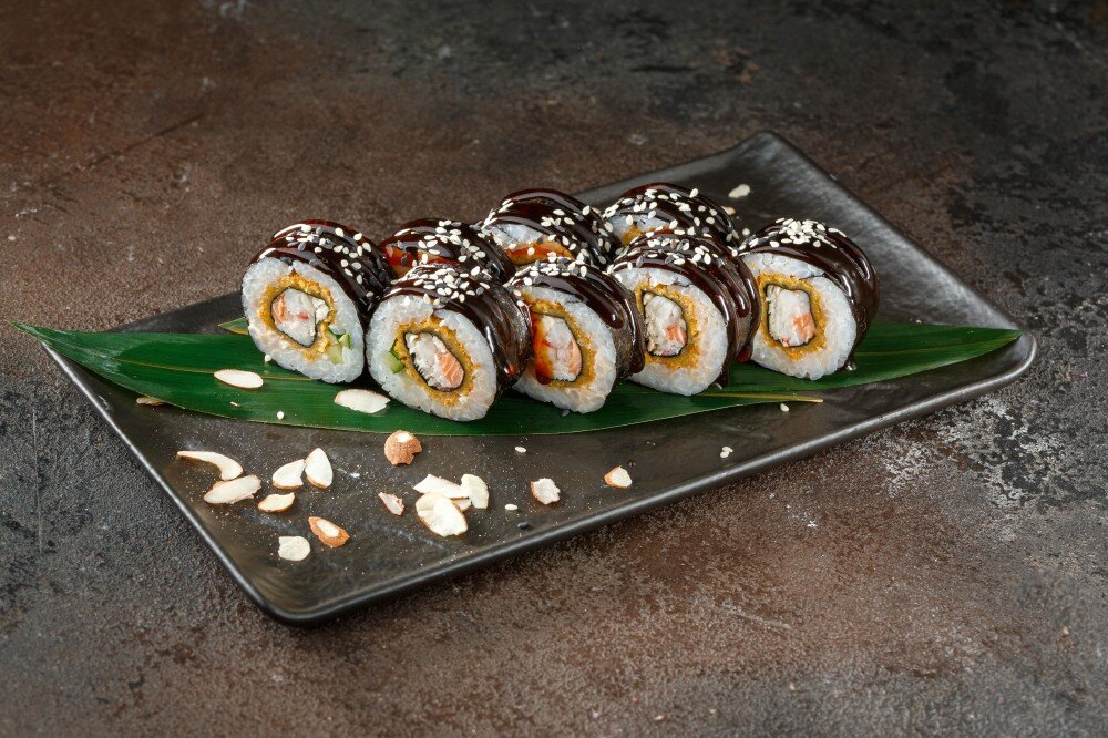Креветка в кляре, угорь в кляре, лосось в кляре, краб в кляре, соус спайси, огурец, унаги, кунжут.
